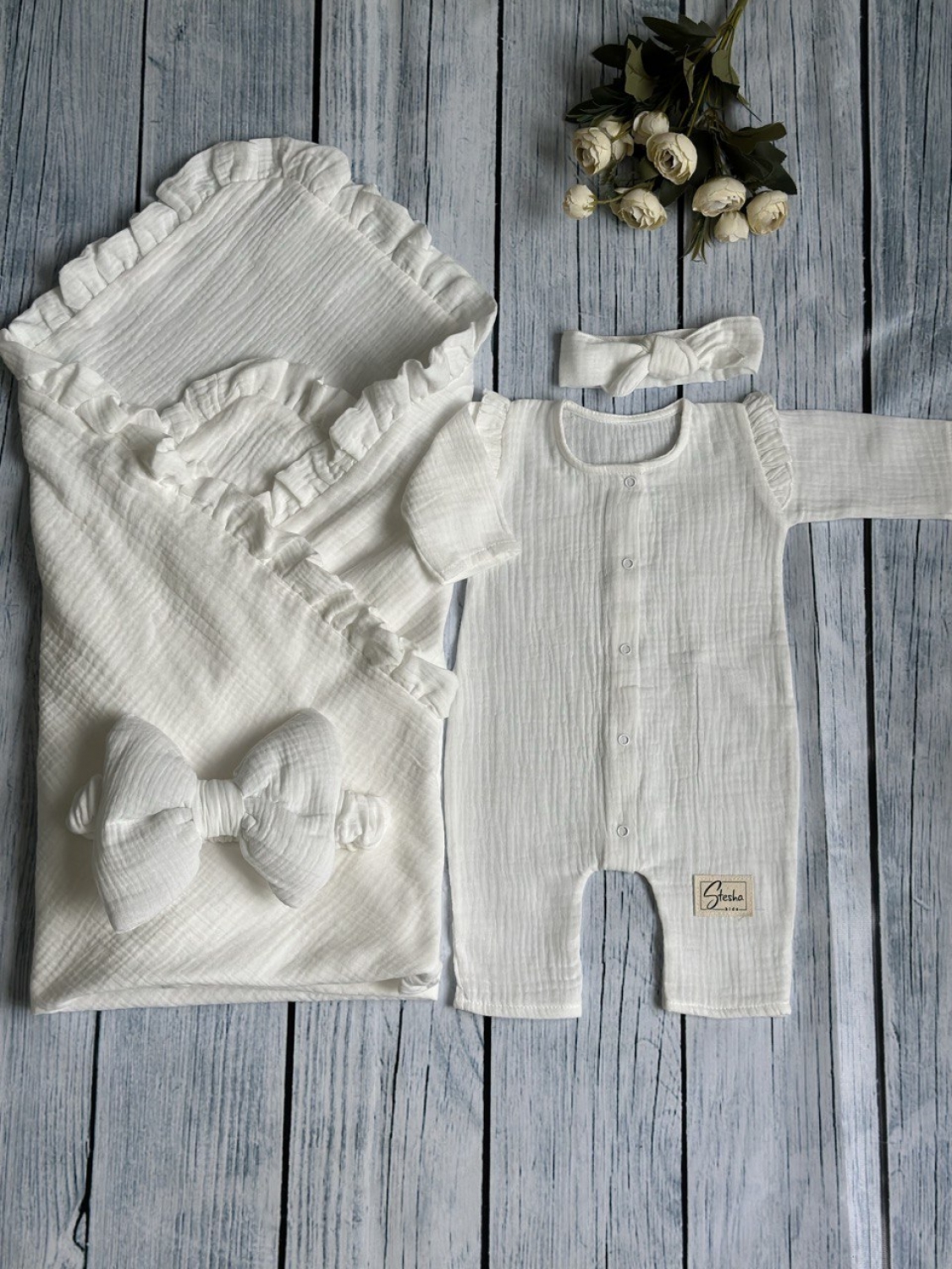 Теги: Купить детские конверты, комбинезон оптом, детские конверты на выписку оптом. 335-М. Комплект из детского комбинезона, р 56 и конверта муслин, хлопок 100% 90/90 см, молочный цена,отзывы официальный сайт "Стеша Псков"