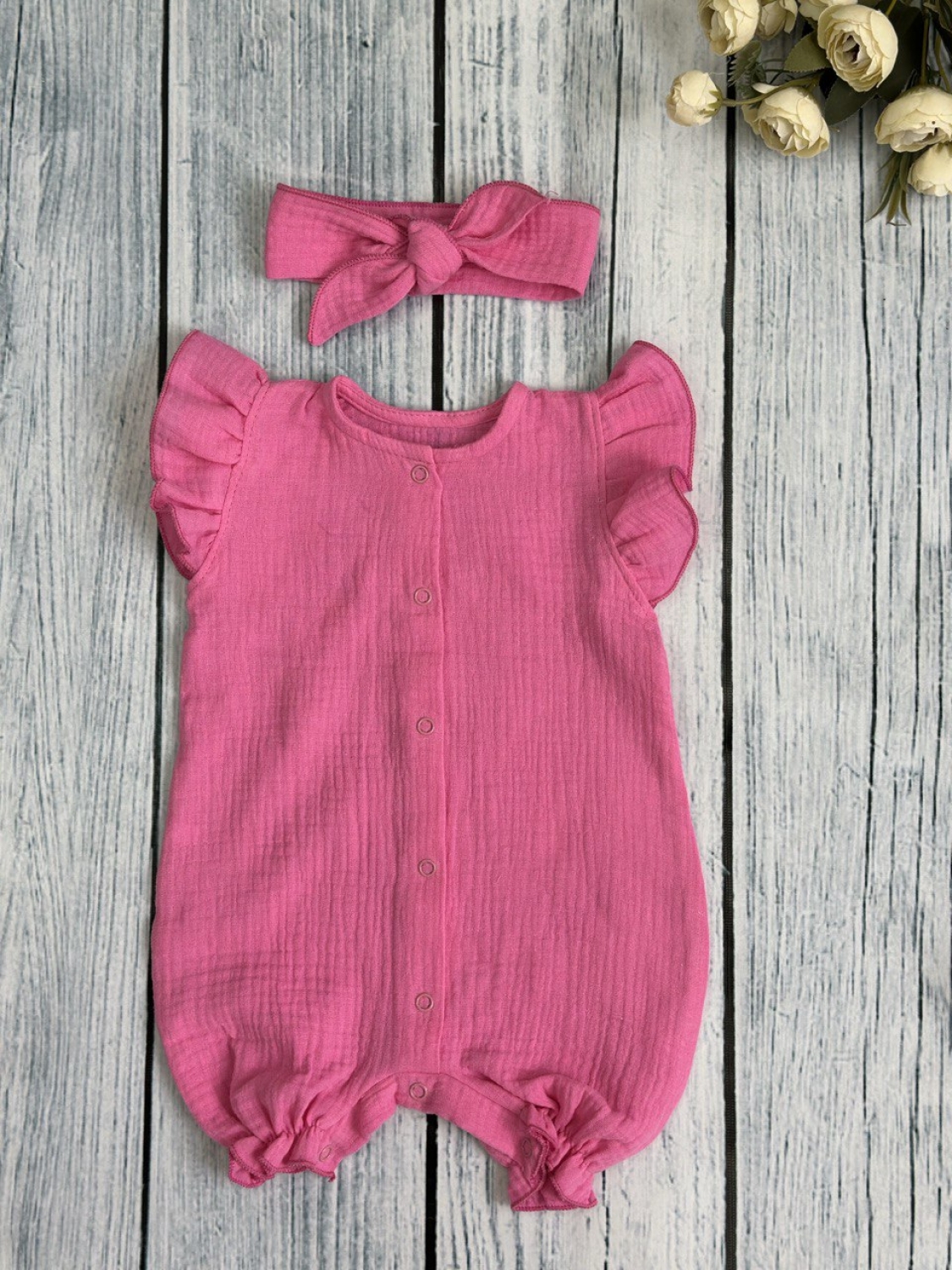 341-Ф. Песочник с повязкой для девочки из муслина, хлопок 100%, р 62,68,74,80 фуксия
