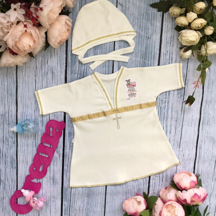 Купить оптом 170. Крестильная рубашка с чепчиком (золото), хлопок 100 % интерлок 62,68,74,80 в Пскове